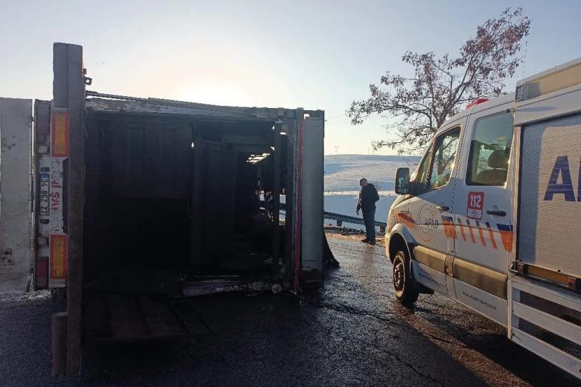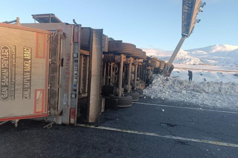Bitlis-Tatvan kara yolunda buzlanma nedeniyle tır devrilmesi sonucu 10 büyükbaş hayvan telef olurken, 1 de kişi yaralandı.