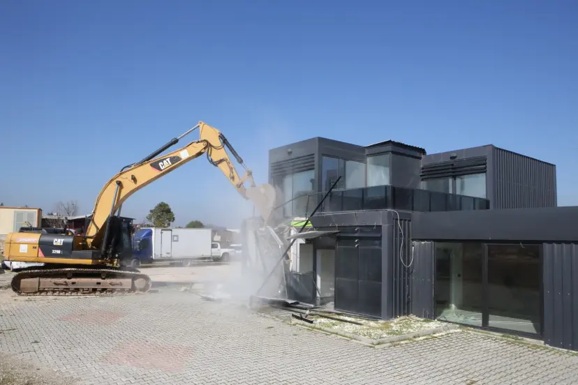 Yıkım çalışması kapsamında ilk olarak, Demirci Mahallesi’nde tespit edilen 192 metrekarelik iki katlı ofis binasına müdahale edildi.