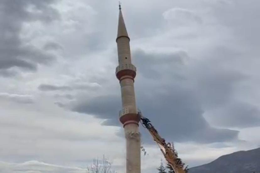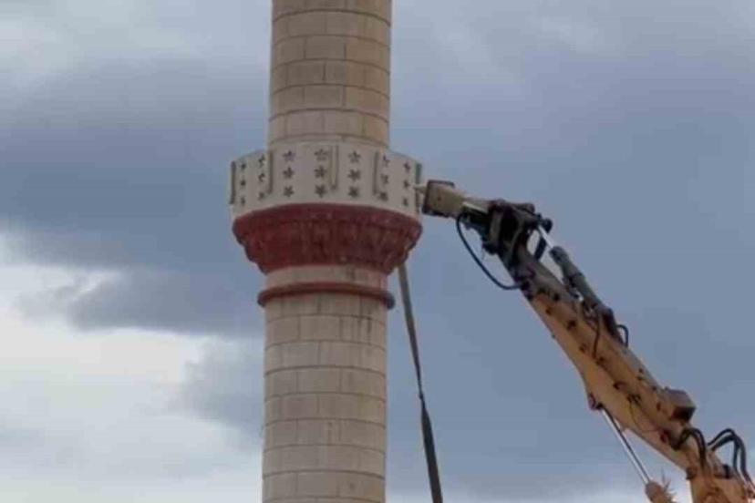 Elazığ’da hasarlı caminin minaresi iş makinesi ile yıkıldı