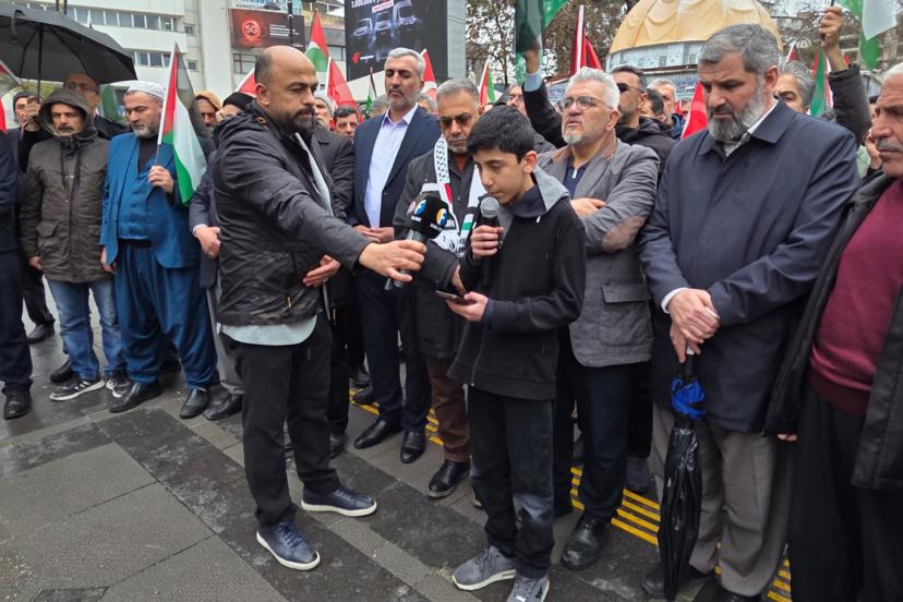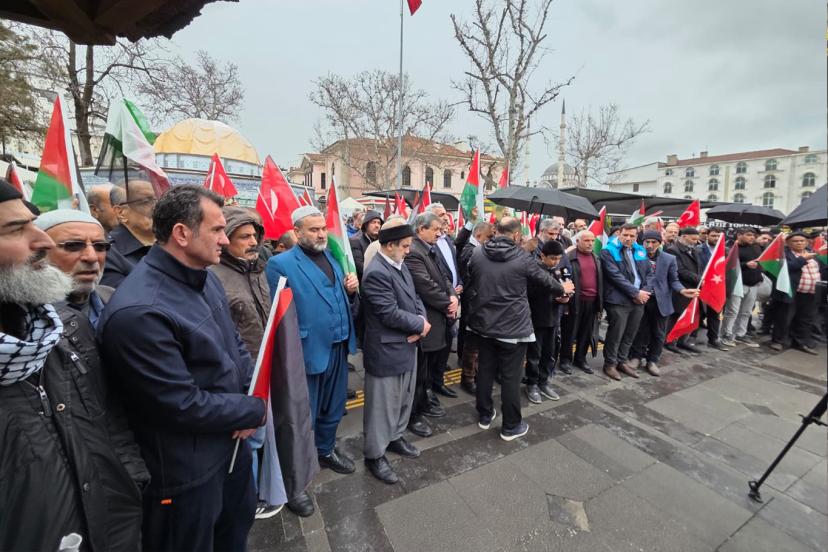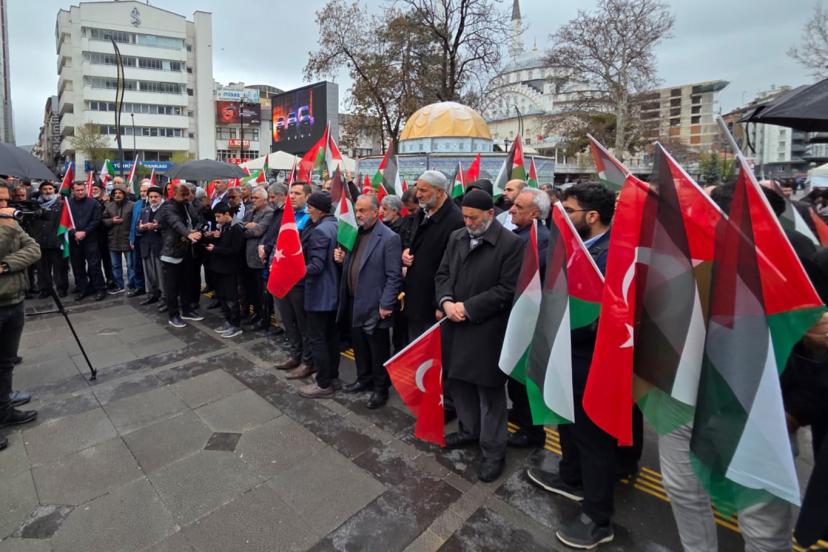 El-Aksa Platformu tarafından PTT Meydanı’nda düzenlen basın açıklamasına soğuk ve yağışlı havaya rağmen yoğun katılım olduğu gözlendi. Programda, platform adına dönem sözcüsü Hakkı Sönmez basın açıklamasını okudu.