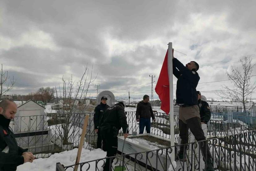 Erzurum’un Hınıs ilçesinde polis ekipleri şehit kabirlerini tek tek temizleyip bakımdan geçirdi.
