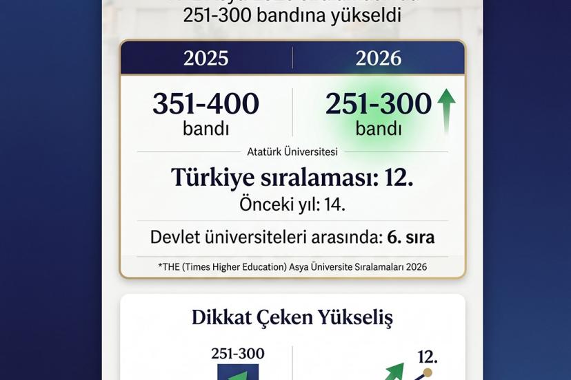 Atatürk Üniversitesi, geçtiğimiz yıl yer aldığı 351-400 bandından 251-300 bandına yükselerek kayda değer bir ilerleme gösterdi. Türkiye genelindeki sıralamada da yükselişini sürdüren Atatürk Üniversitesi, önceki yıl 14. sırada yer alırken 2026 verilerine göre 12. sıraya çıktı. Ayrıca devlet üniversiteleri arasındaki 6. sıradaki konumunu koruyarak istikrarlı başarısını devam ettirdi.
