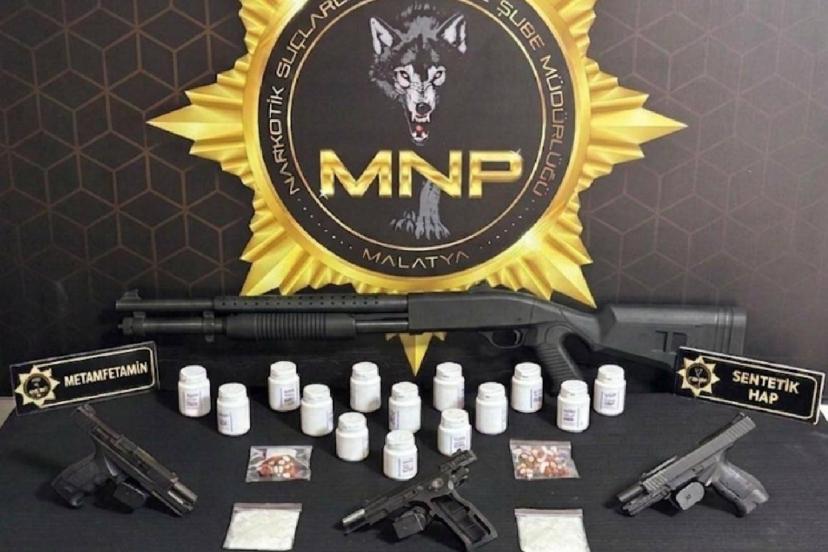 Yapılan aramalarda 812 adet sentetik ecza hap, 37 gram metamfetamin maddesi, 3 adet ruhsatsız tabanca ve 1 adet ruhsatsız tüfek ele geçirildi.