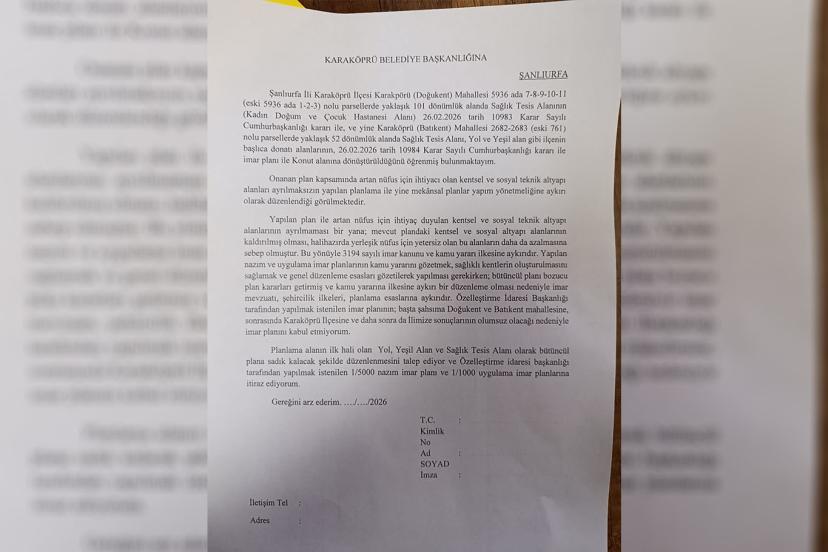 Karaköprü ilçesine bağlı Doğukent Mahallesi’nde bulunan hastane alanının imar planı değişikliğiyle yeniden konut alanına dönüştürülmek istenmesi üzerine mahalle sakinleri harekete geçti.
