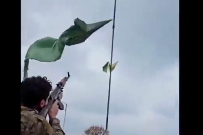 Suriye'nin kuzeydoğusunda geri çekilen YPG/SDG terör örgütüne karşı ilerleyen Suriye ordusundan bir askerin, direkteki sözde bayrağı silahıyla vurarak düşürmesi sosyal medyada etkileşim aldı.