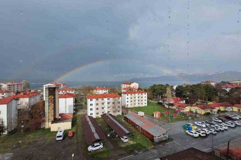 Tatvan’da gün içerisinde etkisini sürdüren yağmur, yerini kısa süreli güneşli havaya bırakınca doğa adeta renk cümbüşüne sahne oldu. Yağışın ardından oluşan gökkuşağı, özellikle Van Gölü’nün üzerinde belirgin şekilde görülürken, Tatvan ilçe merkezinden de net bir şekilde izlenebildi. Göl yüzeyine yansıyan gökkuşağı eşsiz görüntüler ortaya çıkarırken, manzarayı gören vatandaşlar ise cep telefonlarına sarılarak bu anları ölümsüzleştirdi. Şehrin birçok noktasında gökyüzünü süsleyen renkler, kısa sürede ilgi odağı oldu.