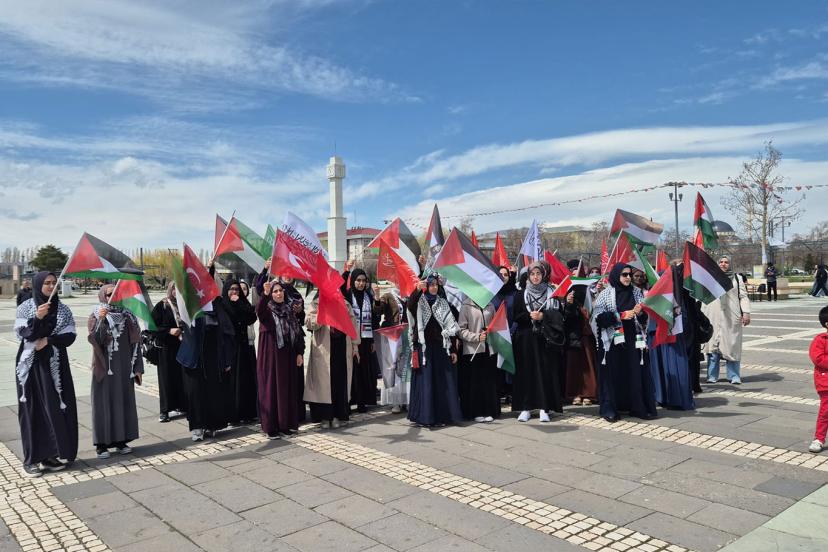 Siyonist rejimin her geçen gün işgali genişlettiğini söyleyen Akkaya, “Gün geçmiyor ki siyonist rejim yeni bir baskı ve hukuksuzluğa kalkışmasın. Kullanım hakkı tamamen Müslümanlara ait olmasına rağmen yakın zamanda İran savaşını bahane ederek Müslümanların Mescid-i Aksaya girişi uzun süre yasaklanmış, son olarak da Mescid-i Aksanın avlusuna Siyonist rejimin bayrağı asılmıştır. Filistin’de, Lübnan’da ve diğer Müslüman coğrafyalarda yaşananlar bir “çatışma” değil, açık bir işgal ve zulümdür. Çocukların, kadınların, sivillerin hedef alındığı; evlerin, hastanelerin, ibadethanelerin bombalandığı bir ortamda susmak ise, zulme ortak olmaktır. Biz üniversiteli gençler ve bütün üniversite personeli olarak susmayacağız. Çünkü inanıyoruz ki zulüm karşısında susan dilsiz şeytandır. Bugün burada sadece Filistin için değil, Müslüman coğrafyanın dört bir yanında yaşanan adaletsizlikler için de konuşuyoruz. Küresel güçlerin çıkarları uğruna Müslüman coğrafyada yürüttüğü politikalar; savaşları, kaosu ve gözyaşını beraberinde getirmiştir. Bu bağlamda Amerika Birleşik Devletleri’nin Müslüman coğrafyada izlediği müdahaleci ve yıkıcı politikaları şiddetle kınıyoruz.” ifadelerini kullandı.