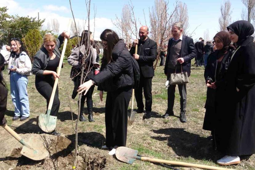 Van Yüzüncü Yıl Üniversitesi (Van YYÜ) yerleşkesinde 100 öğrencinin katıldığı etkinlikte yerel meyve fidanları toprakla buluşturuldu.